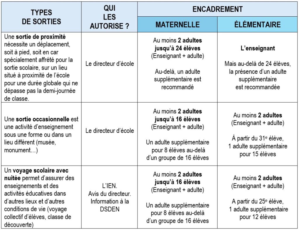 Si une sortie scolaire implique des élèves de l’école maternelle et de l’école élémentaire, seuls les taux d’encadrement de l’école maternelle s’appliquent.