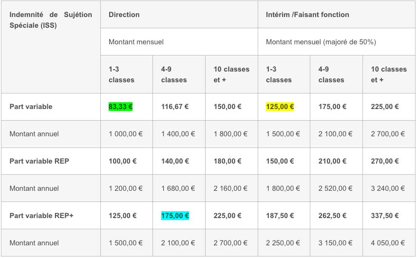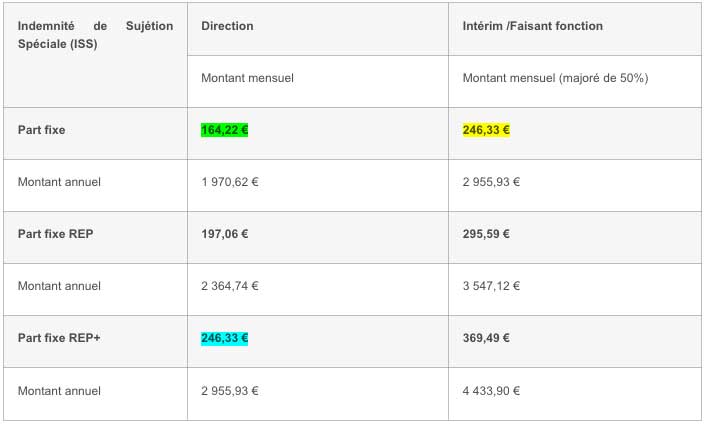 - ISS : Indemnité de Sujétions Spéciales. Elle se compose d’une part fixe et d’une part variable. Ces parts sont majorées de 20% en REP et de 50% en REP+.