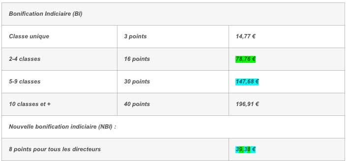 - BI : Bonification Indiciaire. Des points d’indices – selon le nombre de classes de l’école – sont ajoutés à ceux correspondant à l‘échelon détenu.